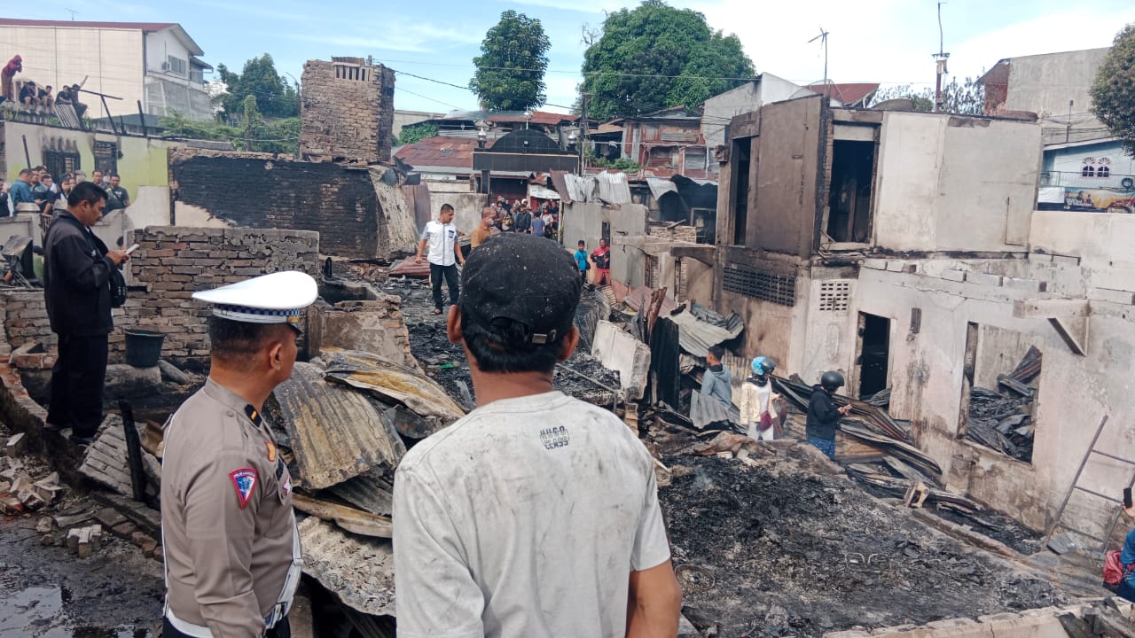 JP. PEMATANG SIANTAR-SUMATERA UTARA. Personil piket Polres Pematangsiantar bersama Polsek Siantar Utara turun melakukan olah TKP kebakaran 25 Unit rumah di Jalan Dr. Wahidin Kelurahan Melayu Kecamatan Siantar Utara, Kota Pematangsiantar pada hari Senin 23 September 2024 sekira pukul 03.15 Wib.