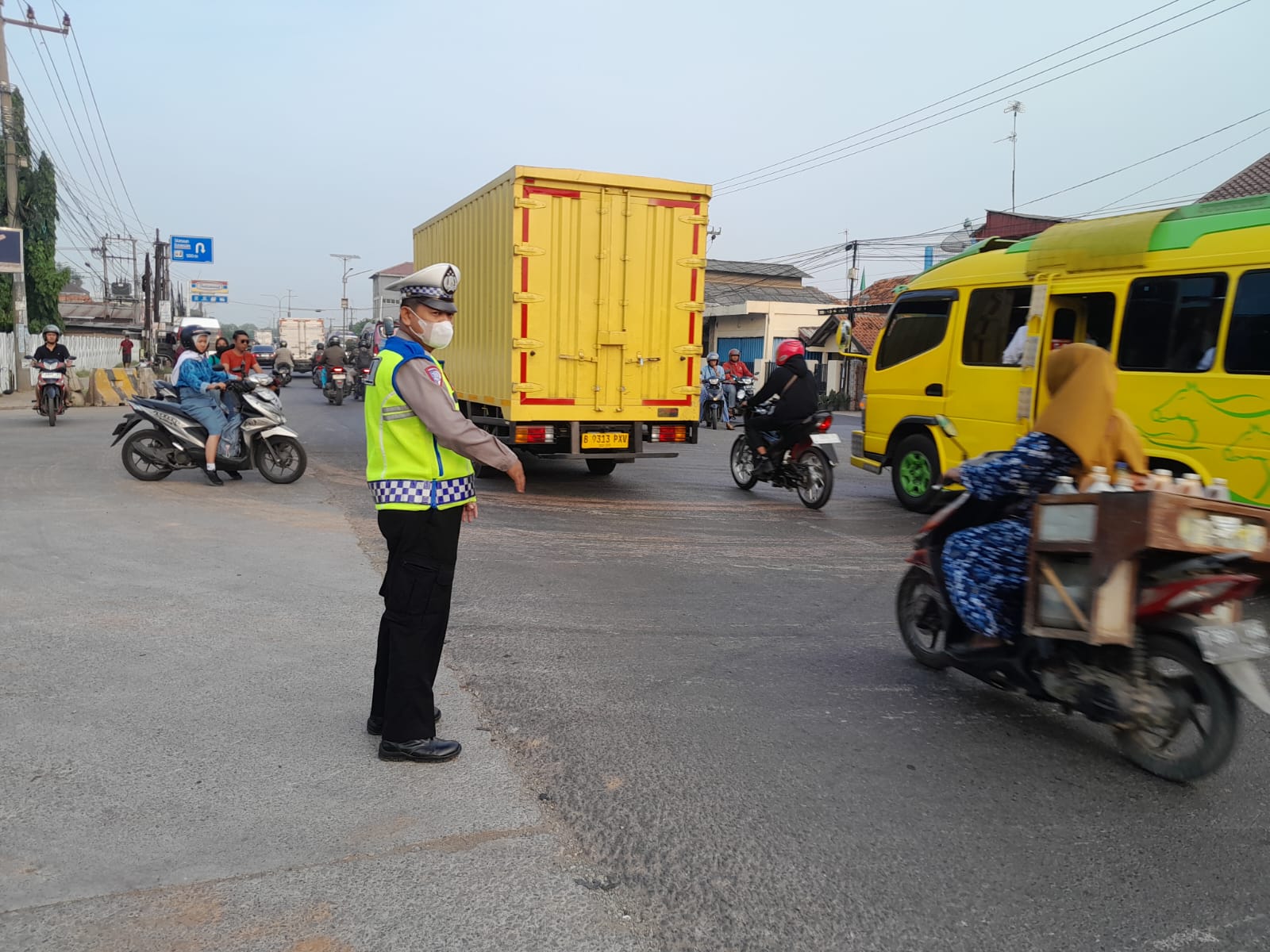 Berikan pelayanan prima kepada masyarakat dan cegah Lakalantas serta kemacetan , personil Unit Lantas Polsek Cikampek Gatur Lalin Pagi didepan Pupuk Kujang Cikampek, yang bertempat di