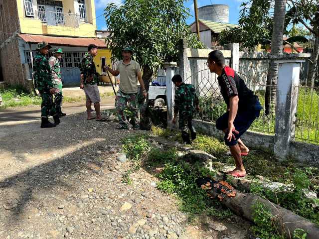 Aroma semangat gotong royong menggema di sepanjang jalan. Di bawah koordinasi Koramil 1420-05/Dua Pitue dan Damkar Dua Pitue, puluhan personel bahu-membahu membersihkan saluran air yang tersumbat.