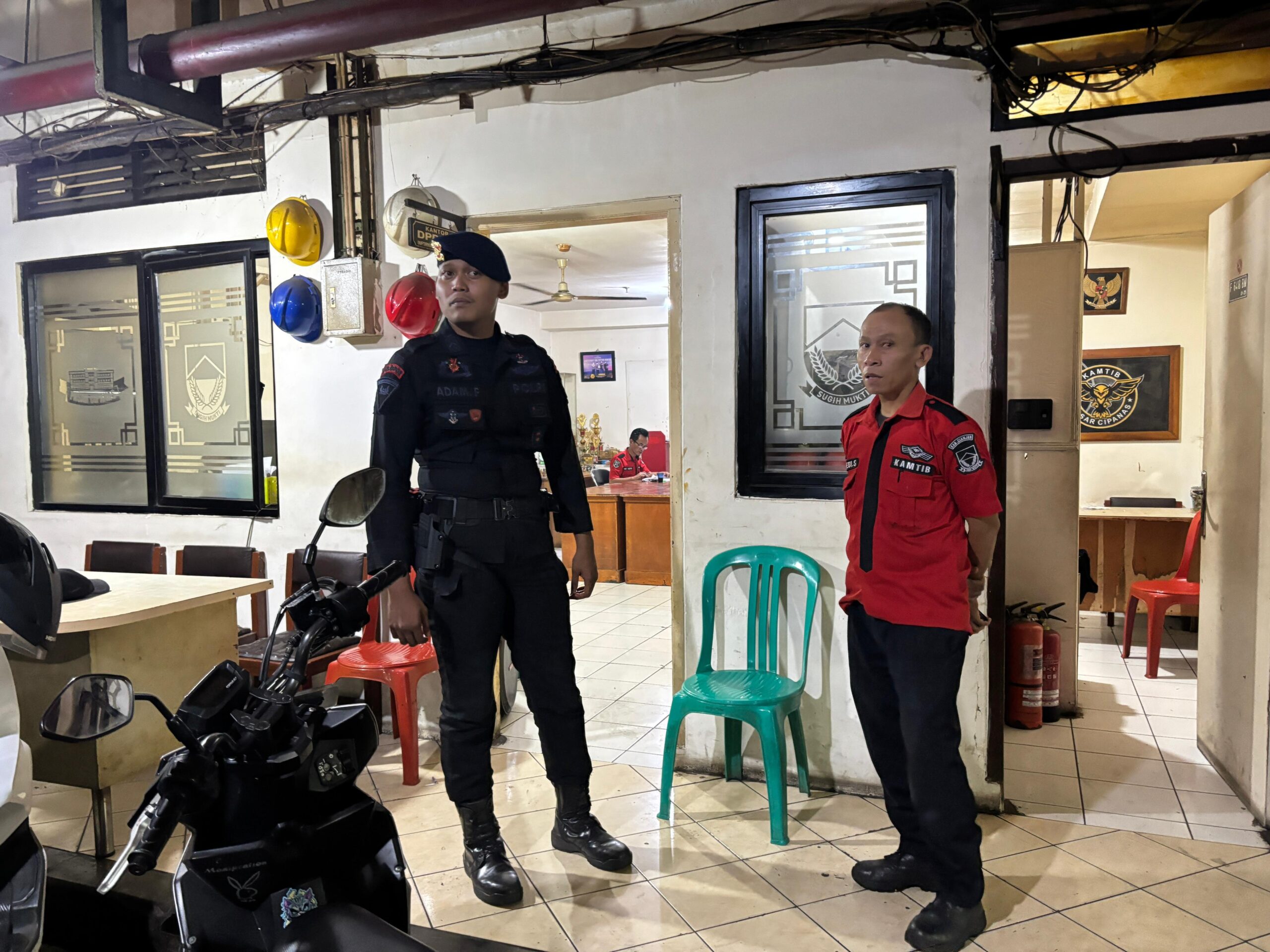 JP. Bripda Adam anggota Brimob Jabar Kompi 3 Batalyon B Pelopor melakukan kunjungan pos Satpam Pasar Cipanas .