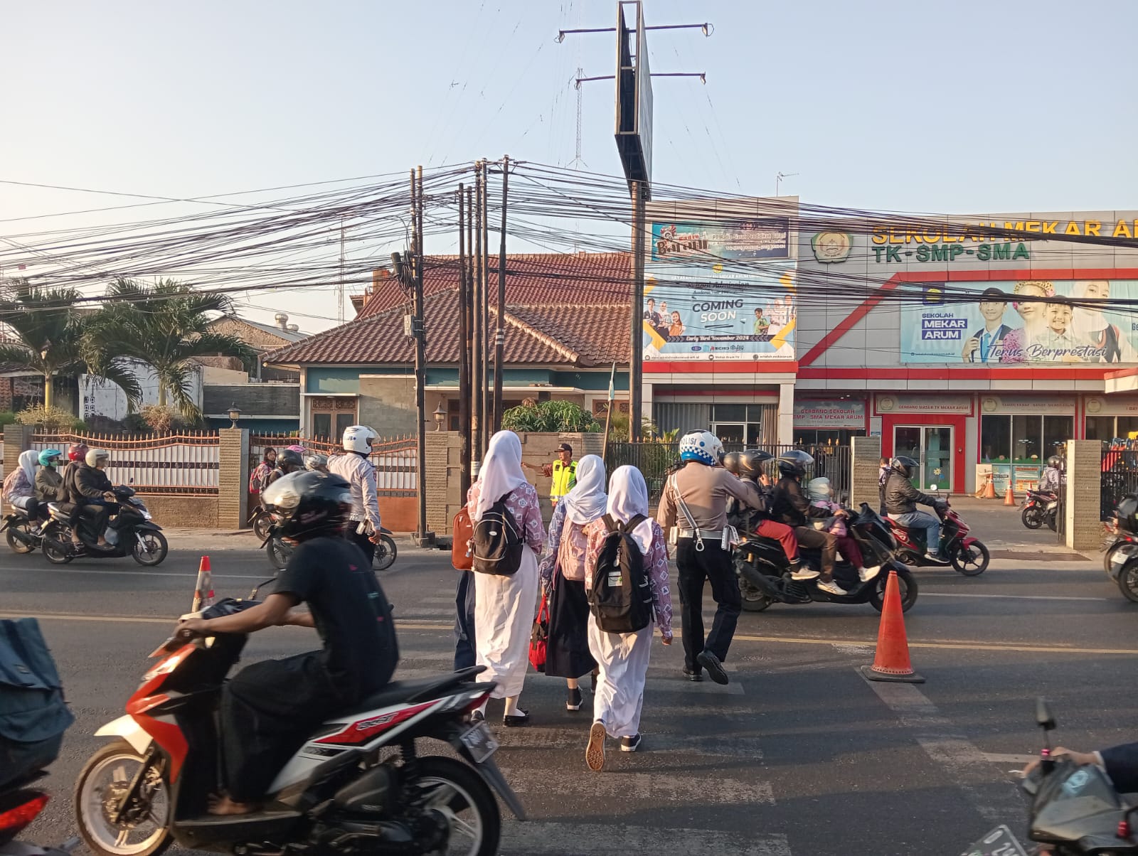 Seperti yang terlihat di depan Sekolah Mekar Arum, Personel Unit Lantas Polsek Cileunyi Polresta Bandung melaksanakan gatur lalin pagi, Membantu Anak Sekolah menyeberang jalan raya untuk menuju sekolahnya maupun warga masyarakat guna antisipasi laka lantas