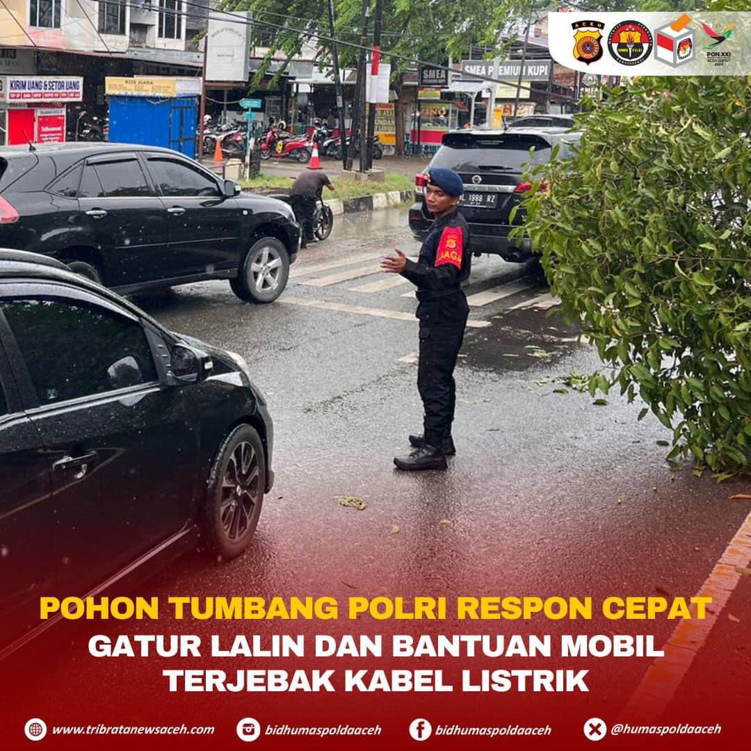 JP. Banda Aceh, 18 Sepetember 2024. Petugas Polri menunjukkan komitmennya dalam menjaga keselamatan masyarakat dengan melakukan respon cepat terhadap insiden pohon tumbang di depan Jln. T. Nyak Arief, Lamgugop, Kecamatan Syiah Kuala, Banda Aceh. Kejadian ini menyebabkan arus lalu lintas terganggu dan kabel listrik tersangkut pada mobil box yang melintas.
