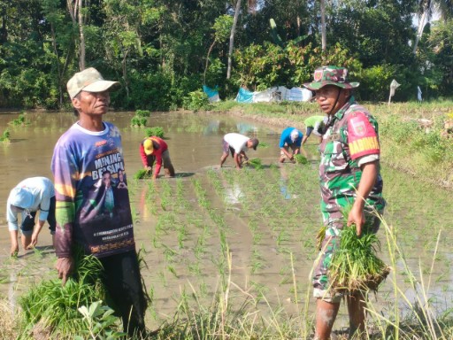 Sertu Bohaseng, Babinsa Desa Mario, bersama anggota Petugas Penyuluh Lapangan (PPL) Kecamatan Kulo dan anggota Kelompok Tani (Poktan) Pasalue, turun langsung ke sawah untuk melaksanakan penanaman padi.