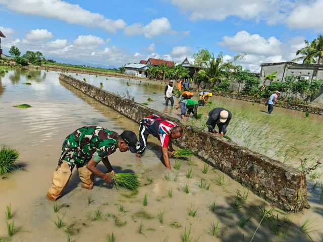 Dengan seragam dinas yang sudah akrab dengan lumpur, Babinsa Desa Bulo Wattang menyatu bersama Kelompok Tani Mekar menanam bibit padi varietas Inpari 50.