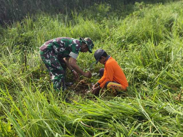 Tak sekadar menanam, para Babinsa juga terlibat penuh dalam pembersihan area, penggalian lubang tanam, hingga memastikan lokasi bebas dari sampah dan semak yang bisa mengganggu pertumbuhan.
