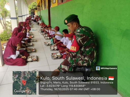 Babinsa Kodim 1420/Sidrap tampak mendampingi para siswa SD menikmati makanan bergizi di sekolah.