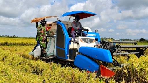 Babinsa mengawal mobil combine harvester saat panen padi di Desa Sereang Sidrap untuk memastikan proses panen berjalan lancar dan hasil petani aman.