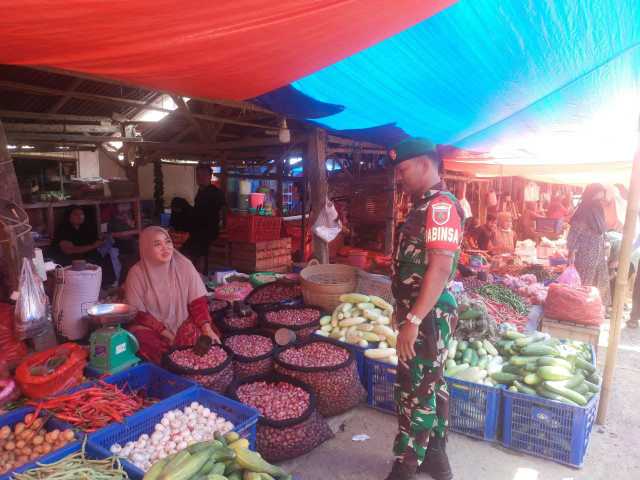 Babinsa Kel. Rappang, Sertu Alimuddin, tak sekadar memantau harga sembako di Pasar Sentral—ia juga tampil sebagai penenang situasi.