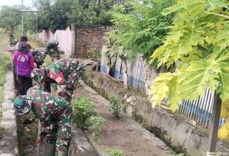 Dipimpin oleh Pelda Muhammad Nur (Batituud), kegiatan karya bakti ini menyasar tumpukan sampah dan sedimen yang menyumbat saluran air.