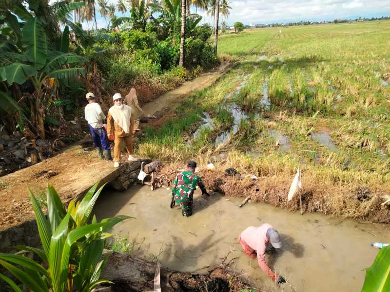 Di tengah guyuran peluh dan canda warga, suasana gotong royong begitu terasa. Serma Afzalul tak hanya mengarahkan, tapi ikut terjun langsung membersihkan saluran irigasi.