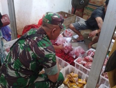 Selama pemantauan, Sertu Sugati menyusuri berbagai lapak pedagang untuk mengecek langsung stok dan perkembangan harga komoditas utama seperti beras, minyak goreng, gula, telur, ayam, dan sayuran segar.
