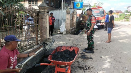 Mobil pemadam kebakaran (Damkar) dikerahkan untuk menyemprot dan meluruhkan lumpur membandel, sementara warga bersama Babinsa mengangkat kotoran dari dasar selokan, termasuk tumpukan sampah rumah tangga dan dedaunan yang lama menutupi aliran.