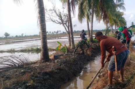 Kegiatan diawali apel pengecekan gabungan pada pukul 08.00 WITA, dilanjutkan kerja bakti hingga pukul 09.30 WITA. Dengan bermodalkan cangkul, para Babinsa dan petani tampak semangat mengangkat endapan lumpur dan mencabut rumput liar yang menghambat aliran air.