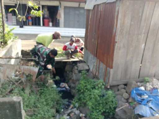 Batuud Koramil 02/Tellu Limpoe, Pelda Jafar bersama warga membersihkan saluran air di Pasar Sentral Amparita.