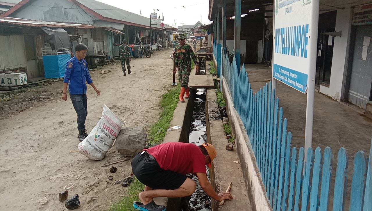 JURNALPOLRI.MY.ID, Sidrap – Personel Koramil 02/Tellu Limpoe Kodim 1420/Sidrap, di bawah komando Batuud Ramil 02/Tellu Limpoe Serma Abd. Halim, bersinergi dengan Dinas Pemadam Kebakaran (PMK) melakukan aksi bersih-bersih di Pasar Amparita, Kelurahan Todang Pulu, Kecamatan Tellu Limpoe, Kabupaten Sidrap.