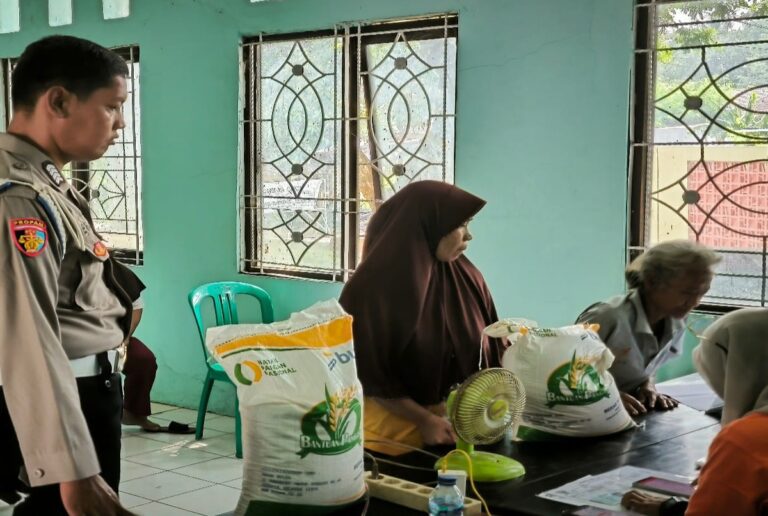 Bhabin Polsek Cikampek Beri Rasa Nyaman Giat Penyaluran Bantuan Cadangan Beras KPM Desa Cikampek Timur