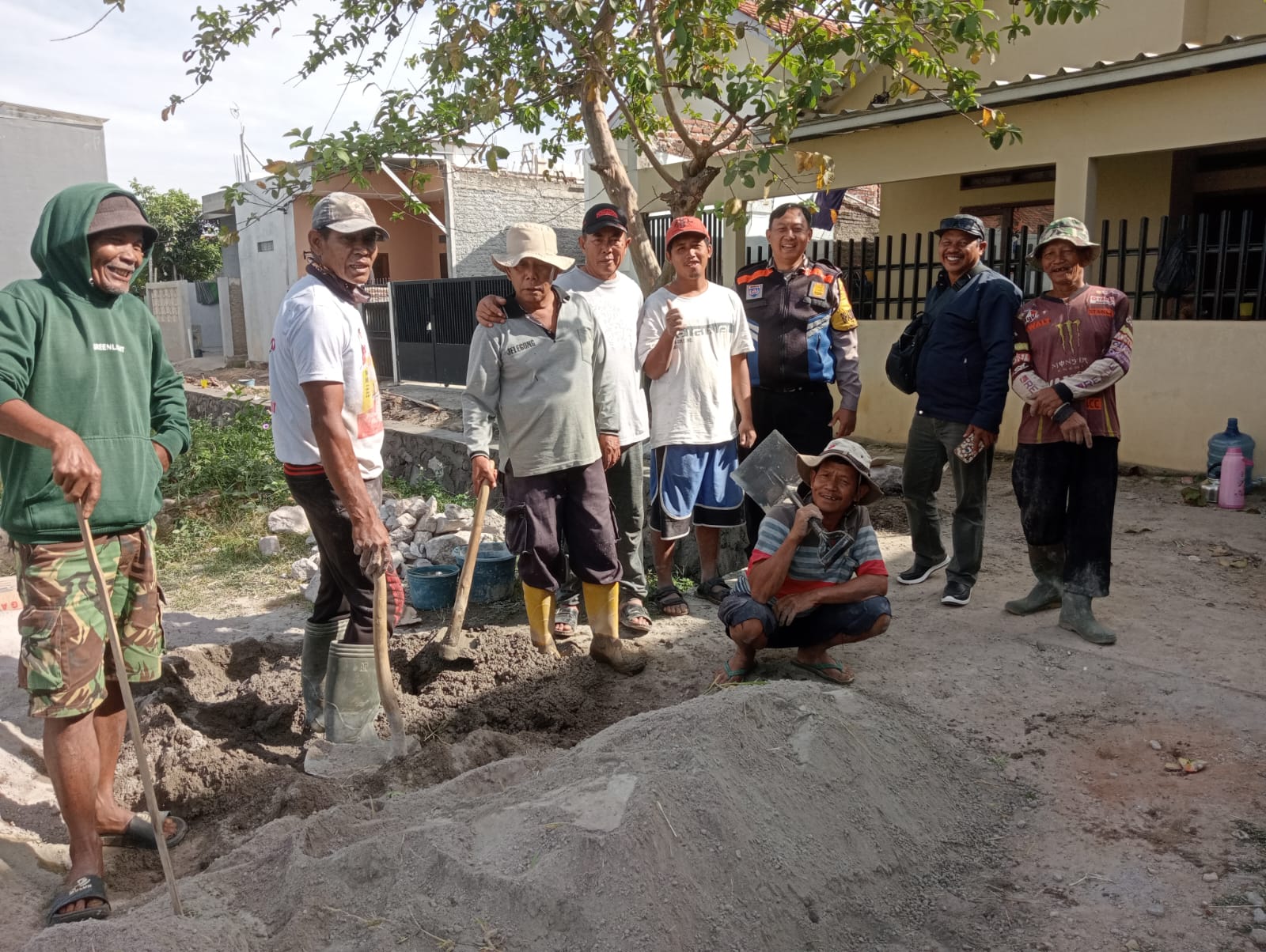 Bhabinkamtibmas Desa Jelegong Kecamatan Rancaekek Aipda Deden Suryadi sambang kamtibmas ke warga binaan yang sedang melaksanakan kerja bakti perbaikan jalan di Komp. Permata Hijau Rw. 17 Desa Jelegong Kec. Rancaekek kemudian sampaikan pesan kamtibmas.