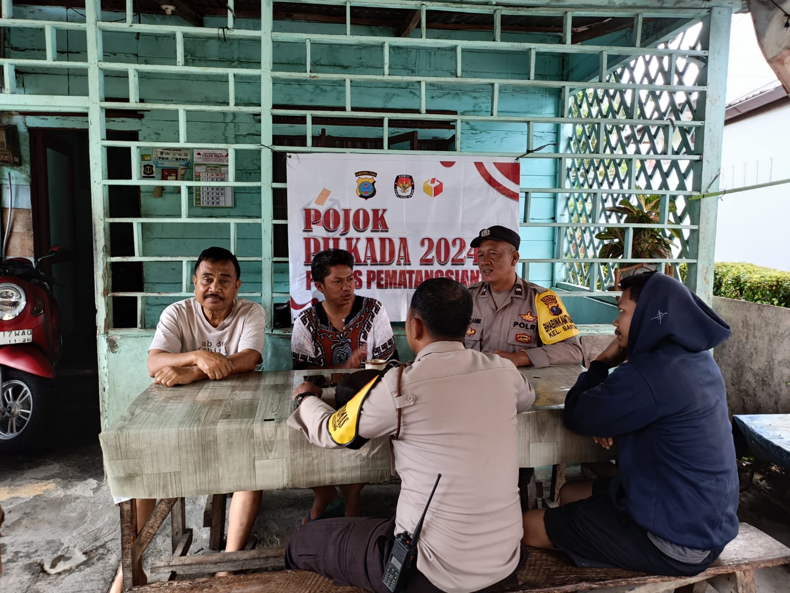 JP. PEMATANG SIANTAR-SUMATERA UTARA. Bhabinkamtibmas Polseķ Sianțar Barat, Polres Pematangsiantar Aiptu Deddy Syam dan Aipda R.P Damanik melaksanakan kegiatan Pojok Pemilu kepada warga yang tinggal di Jln.Kartini GG Andalas Kelurahan Bantan Kecamatan Siantar Barat bertempat di warung Pak Sitompul, pada hari Kamis 9 Oktober 2024 pagi sekira pukul 09.00 Wib.