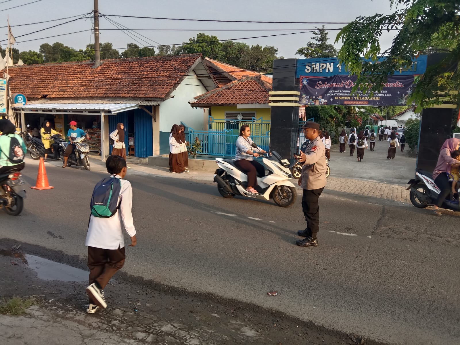 Bhabinkamtibmas Polsek Telagasari Bantu Siswa Menyebrang dan Pastikan Arus lalulintas Kondusif