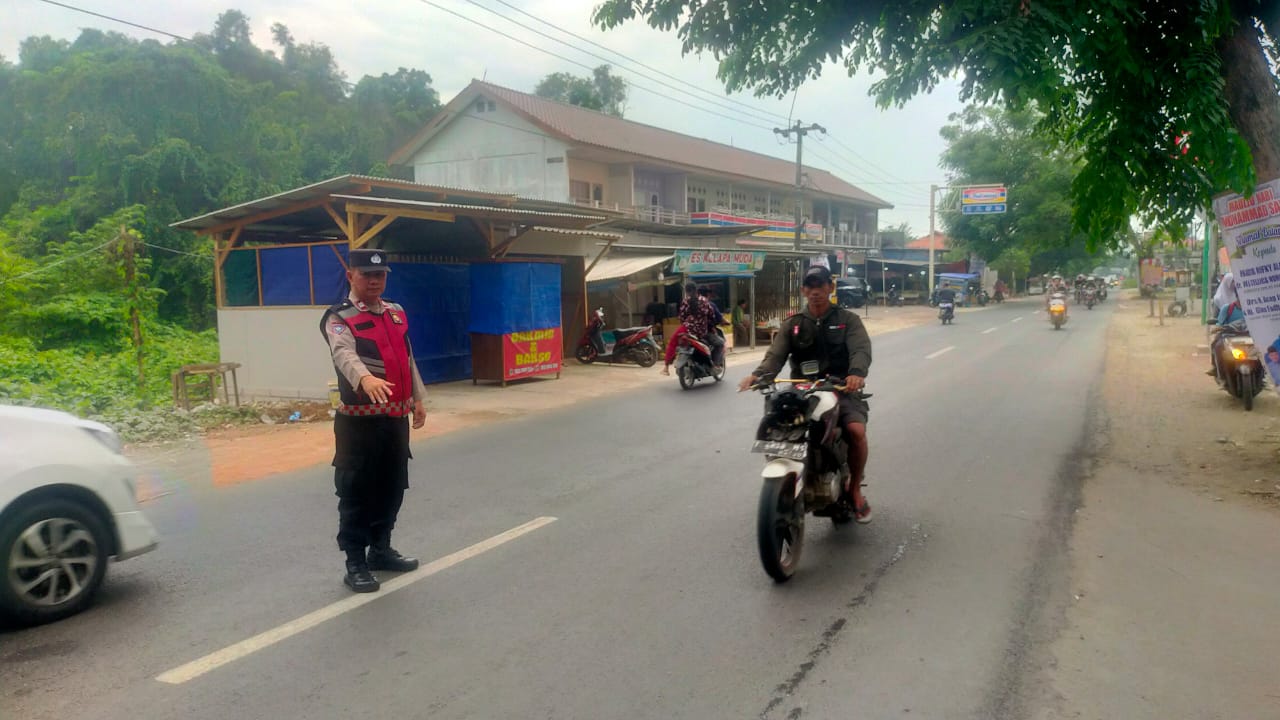 Bhabinkamtibmas Polsek Telagasari Lakukan Pengaturan Lalulintas dan Bantu Sebrangkan Siswa