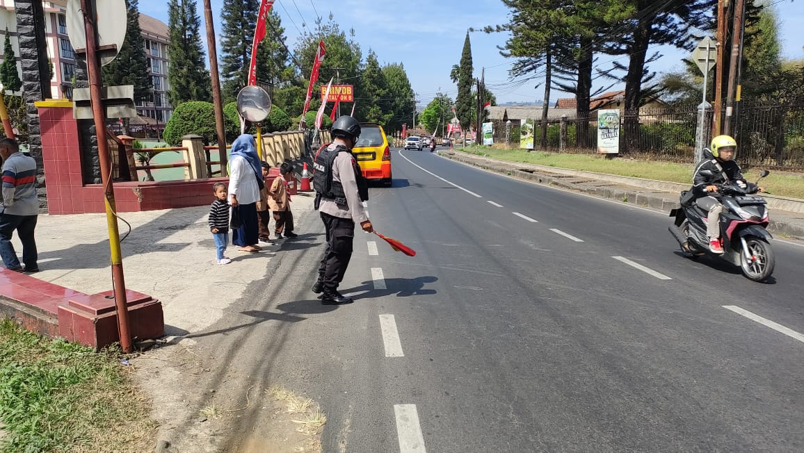 Anggota Brimob Polda Jabar Kompi 2 Batalyon B Pelopor Bripka Suparman Laksanakan gatur lalin membantu masyarakat khusus nya anak-anak yang berpulang sekolah agar tidak terjadi hal-hal yang tidak di inginkan di jalanan .