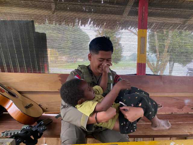 Di tengah udara sejuk khas dataran tinggi Papua, Bripda Wahyu tampak bercengkerama dengan seorang anak kecil. Momen ini menghadirkan gambaran hubungan yang lebih humanis antara aparat keamanan dan masyarakat setempat.