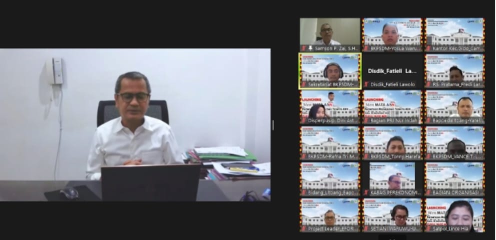Kegiatan launching Men MATA ASN yang dilaksanakan secara daring (zoom meeting) diikuti oleh Sekretaris Daerah Kabupaten Nias, para Pejabat Pimpinan Tinggi Pratama, serta seluruh pejabat dan ASN di Lingkungan Pemerintah Kabupaten Nias.