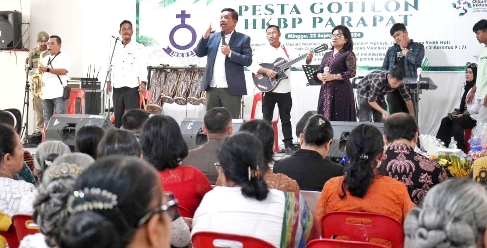 JURNALPOLRI.COM- SIMALUNGUN- SUMUT- Bupati Simalungun Radiapoh Hasholan Sinaga menghadiri pesta Gotilon HKBP Parapat yang berlangsung di Sopo Godang HKBP Parapat Kecamatan Girsang Sipangan Bolon, Simalungun, Sumut, Minggu, (22/9/2024).