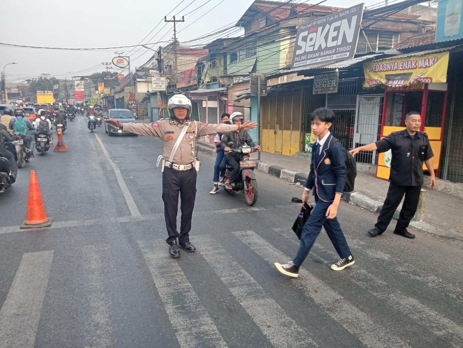 Cegah Kecelakaan, Personil Lantas Polsek Cileunyi Bantu Penyebrangan Anak Sekolah