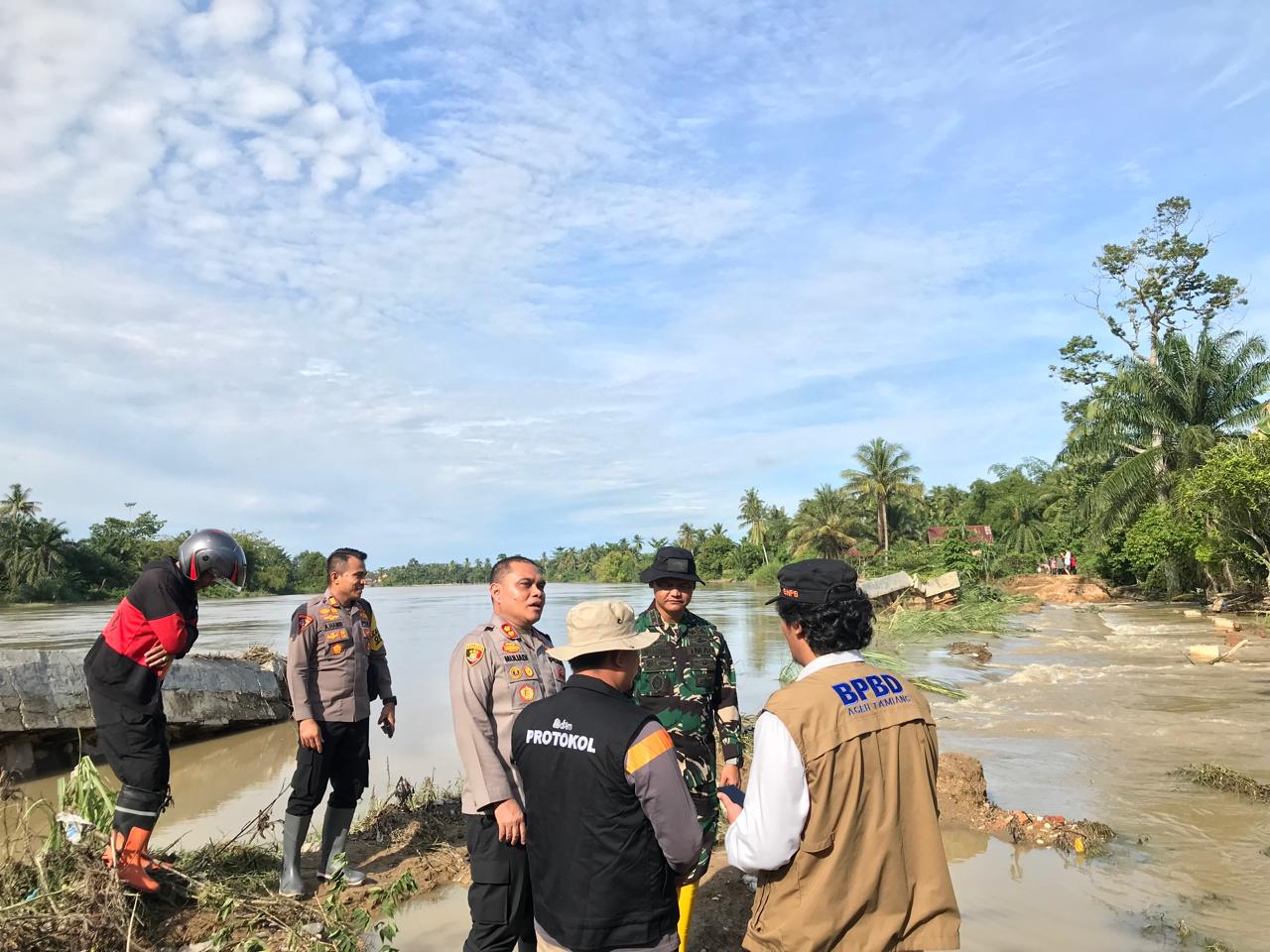 Dandim 0117/Aceh Tamiang Letkol Inf Andi Ariyanto, S.I.P., M.I.P., bersama Kapolres Aceh Tamiang AKBP Muliadi, SH.,MH., didampingi oleh Danramil 03/Seruway Kapten Inf M Rizal setibanya dilokasi mengecek kondisi terkini tanggul yang jebol bebrpa hari yang lalu.