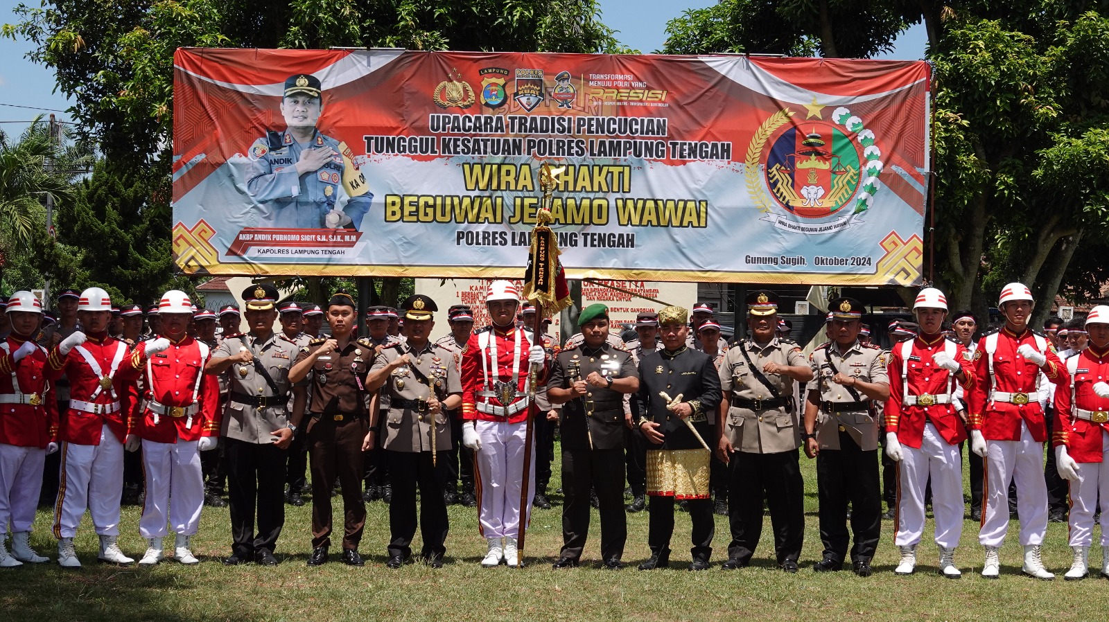 Apel Pelepasan Tunggul Kesatuan Polres Lamteng Wira Bhakti Beguwai Jejamo Wawai dipimpin langsung oleh Kapolres Kota Metro AKBP Heri Sulistyo Nugroho,S, IK,.M, IK, dan Kapolres Lampung Tengah, AKBP Andik Purnomo Sigit,S.H., S.I.K., M.M. sekaligus acara serah terima Tunggul Kesatuan.