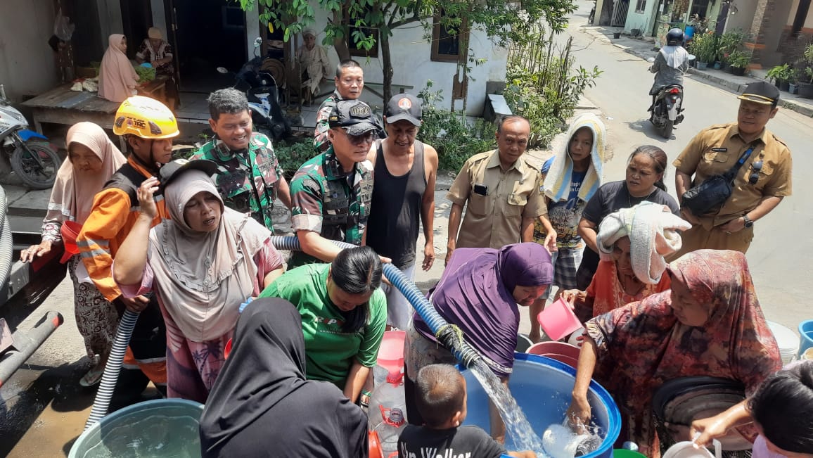 Di lokasi tempat peninjauan lokasi sumur bor dalam rangka TNI AD Manunggal Air, Komandan Kodim 0614/Kota Cirebon berkesempatan ikut membagikan air bersih kepada warga RT.01 RW.05/Kedung Krisik Utara dari PDAM Kota Cirebon bekerjasama dengan BPBD Kota Cirebon.(padmO614)