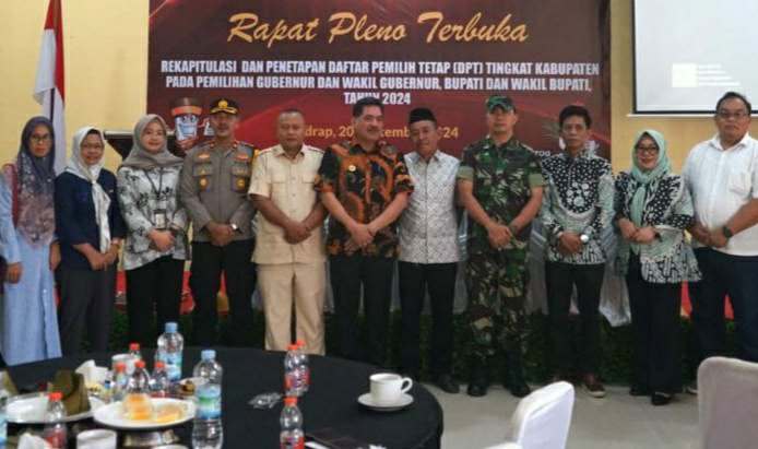 Kegiatan rapat pleno terbuka rekapitulasi dan penetapan Daftar Pemilih Tetap (DPT) pemilihan serentak 2024 di hadiri oleh beberapa tokoh penting Kab Sidrap, Dr. Ns. H. Basra S.Kep., M.Kes. (Pj Bupati Sidrap), Kompol Ahmad Rosma, S.H. (Waka Polres Sidrap), Sutikno, S.H., M.H. (Kajari Kab Sidrap), A. Sugiarno Bahri (Wakil Ketua DPRD Kab Sidrap), Jumadi April Ahmad, S.H., M.H.(Ketua Pengadilan Kab Sidrap), M. Arsul, S.Ip., M.Si. (Ka kesbangpol Kab Sidrap), Andi Patahangi Nurdin (Kadis Kependudukan dan Capil), Anis ST., M.Sib. (Kabag Pemerintahan Kab Sidrap), Abbas Aras SP., M.AP. (Kadis Pemberdayaan Masyarakat, Perempuan dan Anak Kab Sidrap), DR. Muhammad Idris Usman, S.Ag., M.A. (Ka Kemenag Kab Sidrap), Baharuddin Iskandar, S.Pd., M.Pd. (Ka KCD Wil VIII Dispen Prov Sulsel) dan Muhammad Syahrir Aziz, S.H., M.H. (Ka Rutan Kelas IIB Kab. Sidrap)