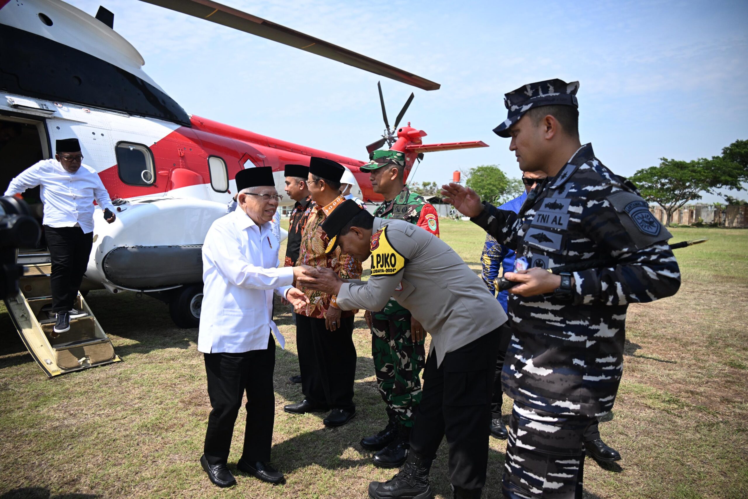 bersama unsur Forkopimda Jawa Barat dan Kabupaten Indramayu menyambut kedatangan Wakil Presiden Republik Indonesia (RI) Prof. Dr. (HC) KH. Ma’ruf Amin beserta rombongan menggunakan Helikopter VVIP Kepresidenan Super Puma H-3203 di wilayah Kabupaten Indramayu (16/10/2024).