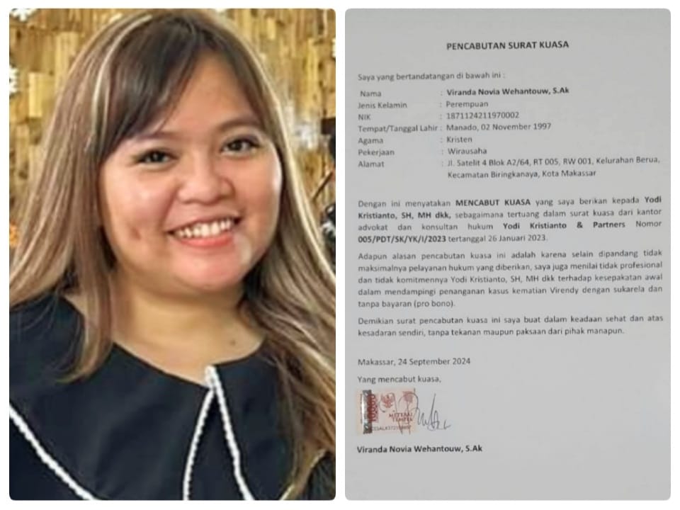 JP. MAKASAR. Memandang dan menilai tidak profesional maupun tidak komitmennya pengacara Yodi Kristianto, SH, MH bersama timnya dalam menangani perkara secara pro bono terhadap kasus kematian Virendy Marjefy Wehantouw, kakak kandung almarhum yakni Viranda Novia Wehantouw, S.Ak akhirnya pada Selasa (24/09/2024) resmi mencabut kuasa hukum yang pernah diberikan kepada advokat muda tersebut.