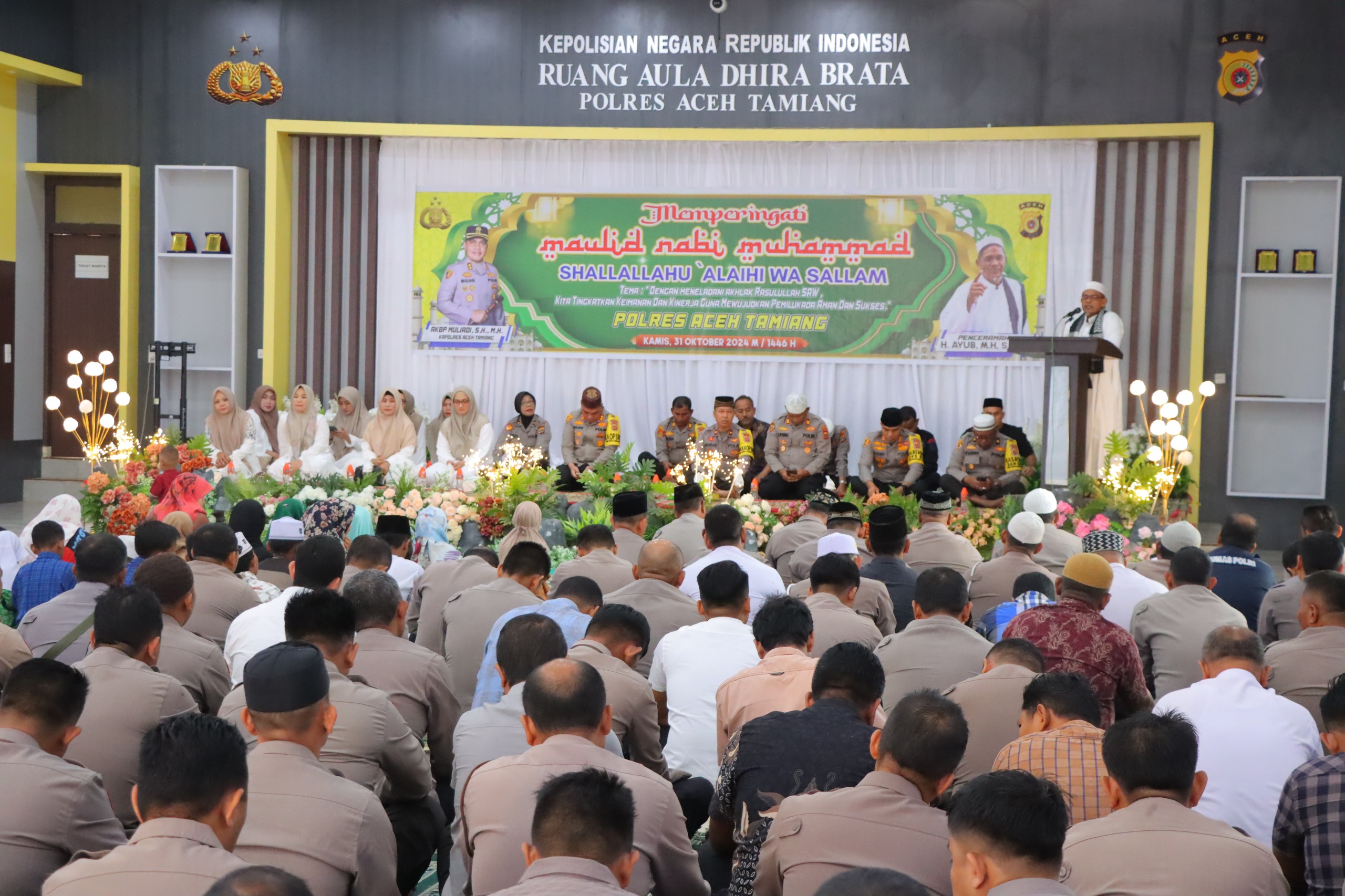 JURNAL POLRI.COM-ACEH TAMIANG-ACEH-Polres Aceh Tamiang mengelar kegiatan Maulid Nabi besar Muhammad S.a.w tahun 1446 H/2024 M dengan tema “Dengan Meneladani Akhlak Rasulullah SAW, Kita Tingkatkan Keimanan Dan Kinerja Guna Mewujudkan Pemilukada Aman dan Sukses” bertempat di Aula Dhira Brata Mapolres Aceh Tamiang. Kamis 31 Oktober 2024