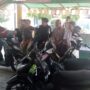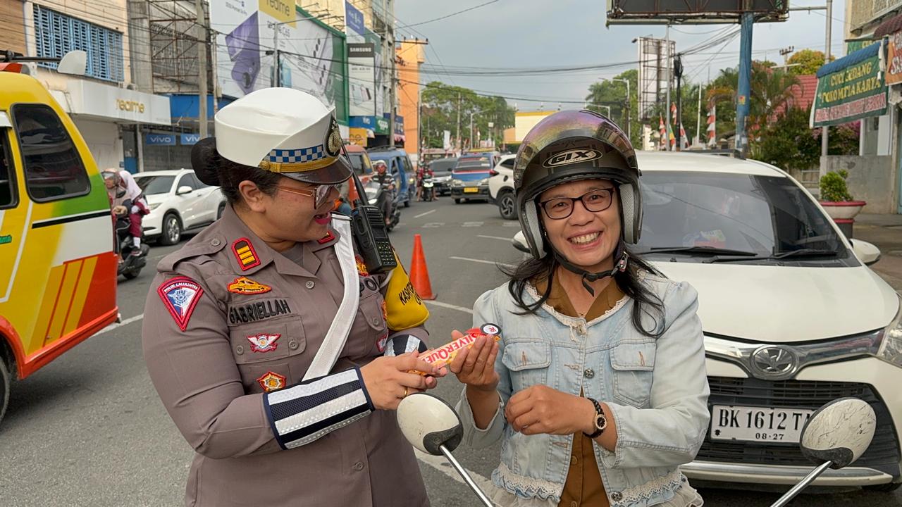 Disela sela kegiatan Gatur Lalin, Dengan senyum Polwan Polres Pematangsiantar memberikan bunga dan coklat kepada para pengendara sepeda motor yang mematuhi aturan berlalu lintas.