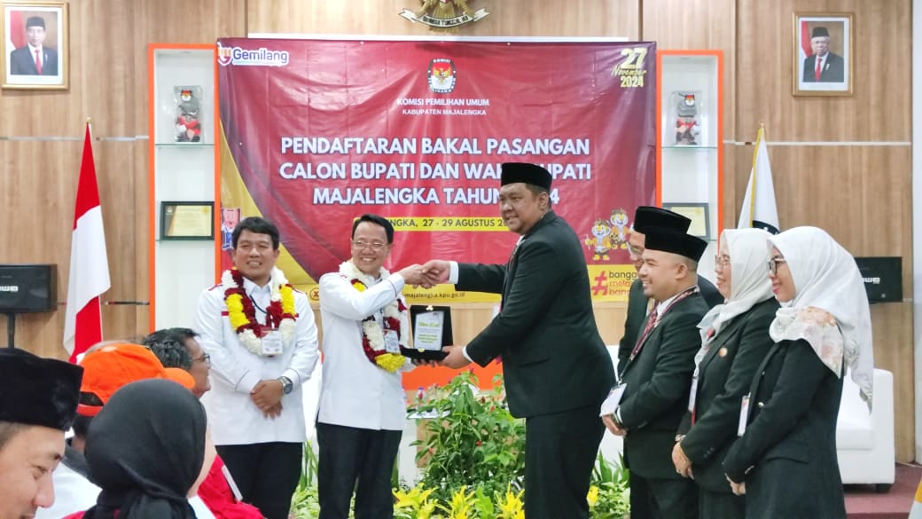 Majalengka.jurnalpolri.my.id- Komisi Pemilihan Umum (KPU) Kabupaten Majalengka di tahapan hari pertama pedaftaran pasangan bakal Calon Bupati dan Wakil Bupati. KPU menerima secara resmi berkas pendaftaran pasangan Dr.H. Karna Sobahi, M.M.Pd dan Koko Suyoko sebagai calon Bupati dan calon Wakil Bupati Majalengka 2024 yang di usung dari Partai PDIP, PKS, Partai Umat, PBB, Perindo, PKN dan Partai Buruh.
