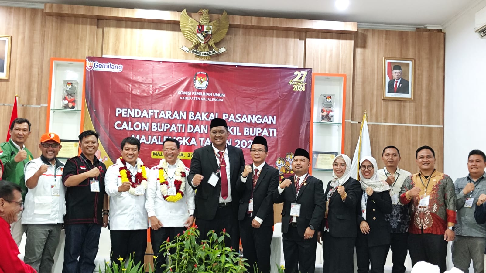 MAJALENGKA.JURNALPOLRI.MY.ID-Komisi Pemilihan Umum (KPU) Kabupaten Majalengka di tahapan hari pertama pedaftaran pasangan bakal Calon Bupati dan Wakil Bupati. KPU menerima secara resmi berkas pendaftaran pasangan Dr.H. Karna Sobahi, M.M.Pd dan Koko Suyoko sebagai calon Bupati dan calon Wakil Bupati Majalengka 2024 yang di usung dari Partai PDIP, PKS, Partai Umat, PBB, Perindo, PKN dan Partai Buruh.