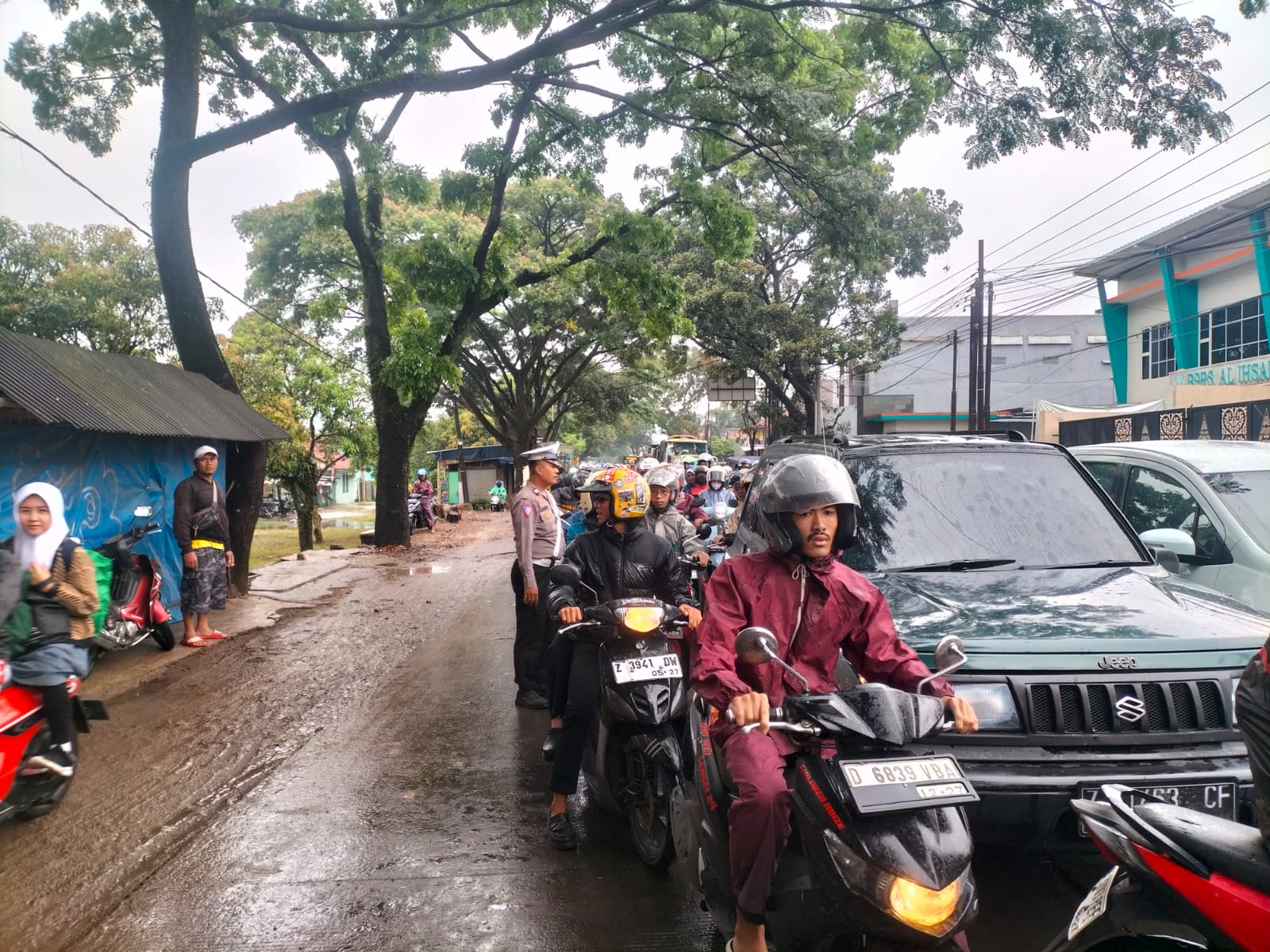 JP Baleendah – Hujan reda, Unit Lantas Polsek Baleendah Polresta Bandung Polda Jabar rutin melaksanakan pengaturan lalu lintas pagi hari dan sore.