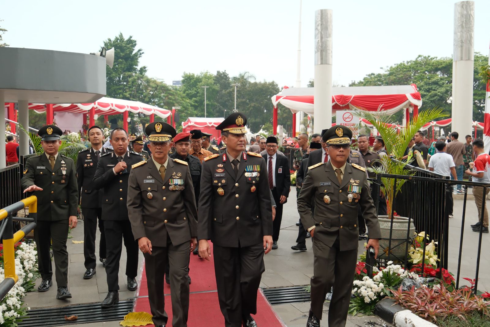 JP. Wakapolda Jabar Brigjen Pol. Bariza Sulfi beserta para Pejabat Utama Polda Jabar menghadiri upacara penurunan Bendera Merah Putih dalam rangka HUT Kemerdekaan RI ke-79 di Lapangan Gasibu Bandung, Sabtu (17/08/2024).