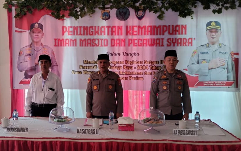 Kasatgas II Preemtif, AKBP Moh. Taufik, dalam sambutannya menyatakan pentingnya pelatihan ini untuk menjadikan Imam Masjid dan Pegawai Syara’ sebagai garda terdepan dalam menangkal paham radikal dan intoleransi.