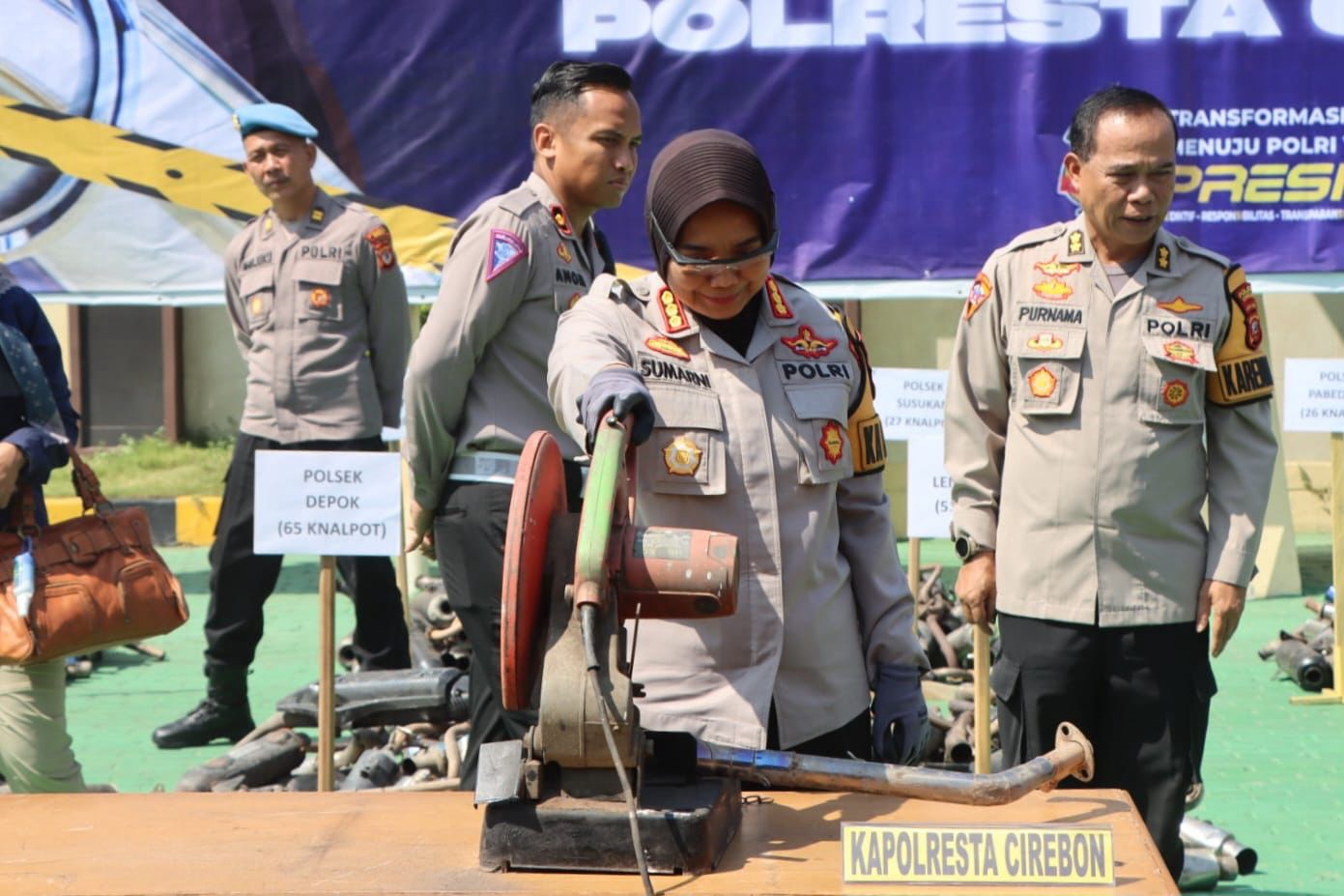 JP. Kepolisian Resor Kota Cirebon ( Polresta Cirebon ) kembali memusnahkan ribuan knalpot tidak sesuai spesifikasi teknis (bising) yang disita Satuan Lalu Lintas (Satlantas) dan 27 Polsek se-Polresta Cirebon.