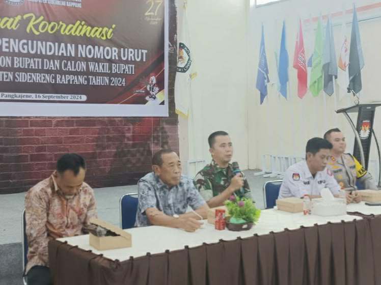 JURNALPOLRI.MY.ID, Sidrap – Rapat Koordinasi Persiapan Pengundian Nomor Urut Pasangan Calon Bupati & Calon Wakil Bupati Kabupaten Sidrap berlangsung di Aula Kantor KPU, Sidrap, Senin (16/09/2024). Dipimpin oleh Ketua KPU Sidrap, Saharuddin, S.H., acara ini dihadiri oleh berbagai tokoh, M. Arsul (Ka Kesbangpol mewakili Pj. Bupati Sidrap), H. Ruslan, S.H., M.A.P. (Ketua DPRD Kab. Sidrap), AKBP Dr. Fantry Taherong, S.H., S.I.K., M.H. (Kapolres Sidrap), Letkol Inf Awaloeddin, S.I.P. (Dandim 1420/Sidrap), Saharuddin, S.H. (Ketua KPU Kab. Sidrap), Kompol Nasri, S.Sos. (Kabag Ops Polres Sidrap), AKP. Lukman (Kasat Intel Polres Sidrap), Bahar (Staf Dishub Kab. Sidrap), Yusrih (Staf Divisi Hukum, Pencegahan, Parmas dan Humas Bawaslu Kab. Sidrap), Para LO Perwakilan masing-masing calon dari Sarkanaah, Doata dan Hamasna.