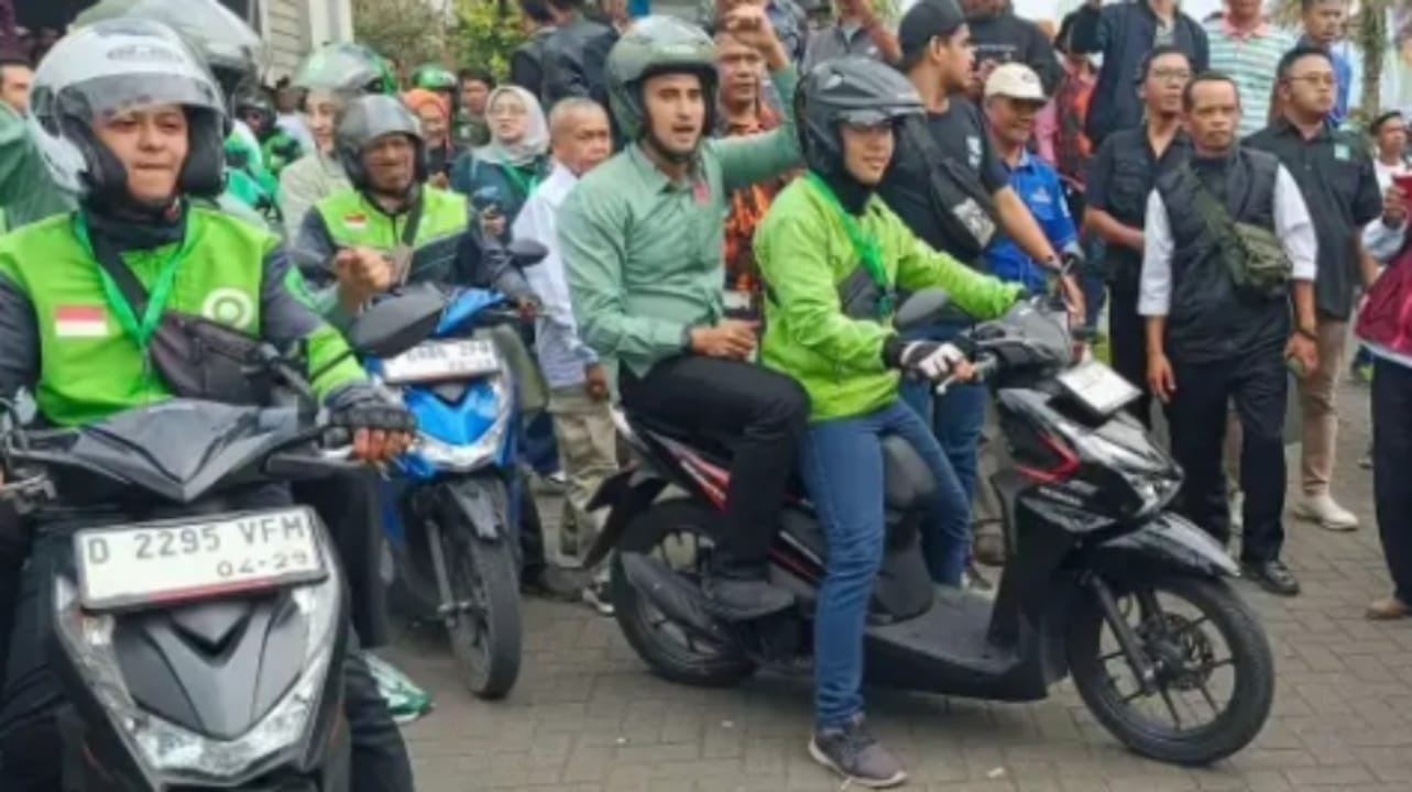 Kang DS dan rombongan berangkat dari Hotel Sutan Raja seusai acara Deklarasi pasangan ‘Bedas Lanjutkan’ yang dihadiri ribuan warga dari 31 kecamatan se-Kabupaten Bandung. Baik Kang DS dan Ali Syakieb kompak memilih menggunakan ojek bersama para pendukungnya.