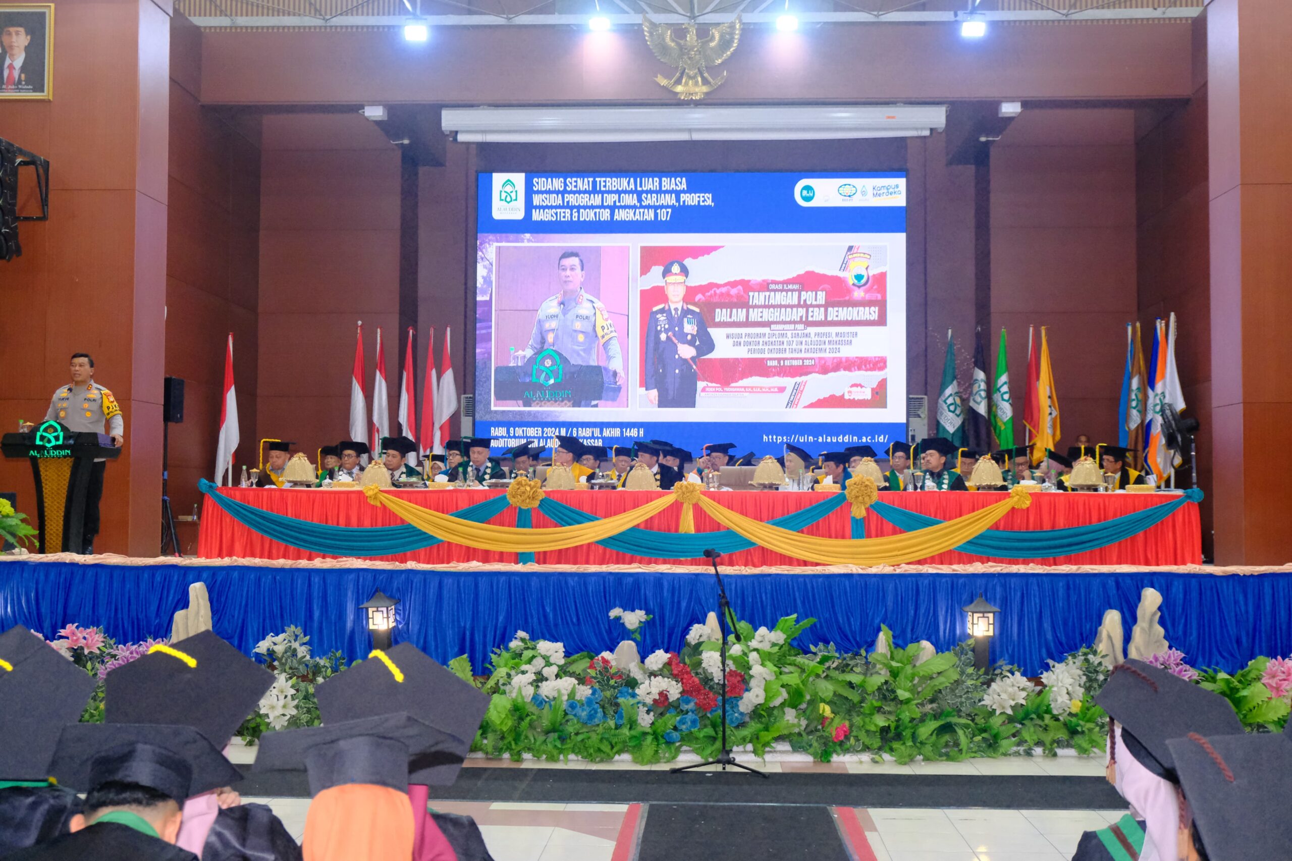 Kapolda Sulsel Irjen Pol Yudhiawan menyampaikan orasi ilmiah pada Wisuda Program Diploma, Sarjana Profesi, Magister dan Doktor Angkatan 107 Universitas Islam Negeri (UIN) Alauddin Makassar, Rabu (09/10) di Gedung Auditorium Kampus UIN, Kab. Gowa.
