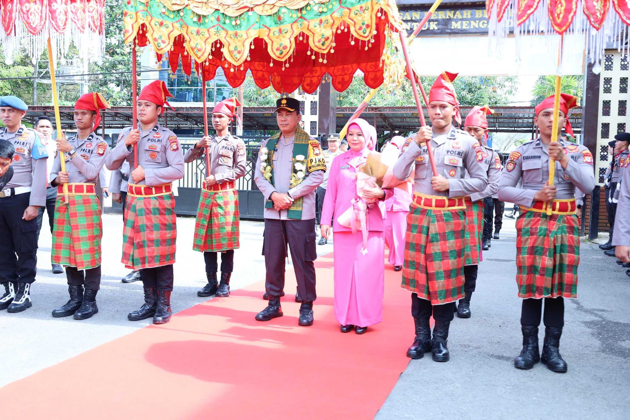 Kapolda disambut dengan upacara adat khas Takalar. Kapolres Takalar, AKBP Gotam Hidayat, S.I.K., M.Si., menyematkan salempang sarung sebagai simbol penghormatan, sementara Ny. Yunita Yudhiawan menerima buket bunga dari Ketua Bhayangkari Cabang Takalar, Ny. Dewi Gotam Hidayat.