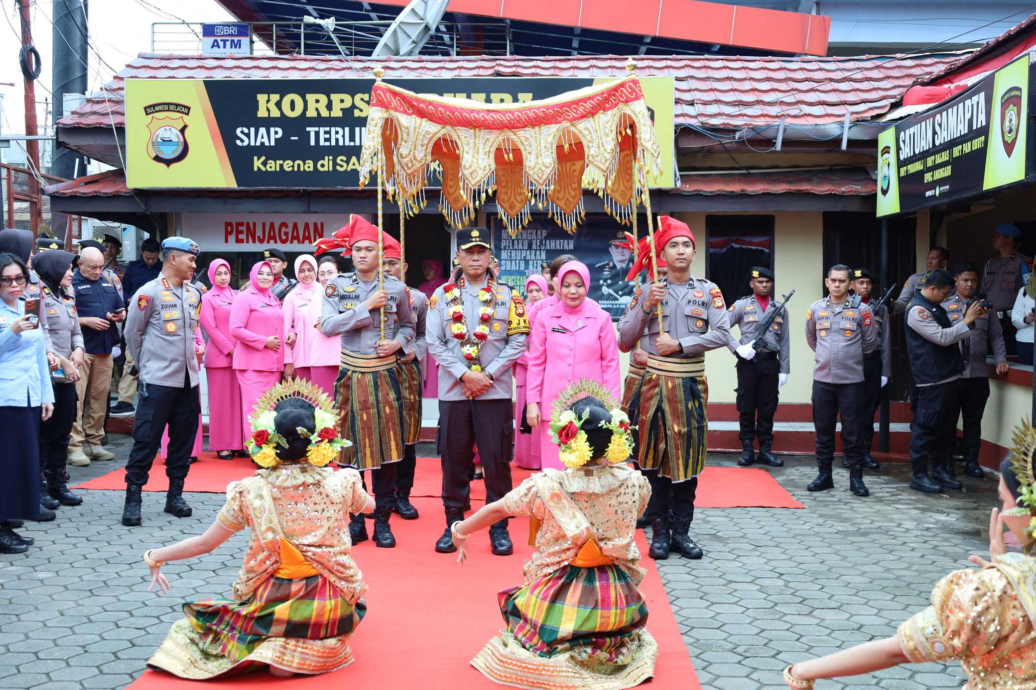 Kedatangan Kapolda Sulsel di Polres Pelabuhan Makassar disambut dengan upacara adat yang diawali dengan pemasangan salempang sarung oleh Kapolres Pelabuhan Makassar, AKBP Restu Wijayanto, S.I.K.