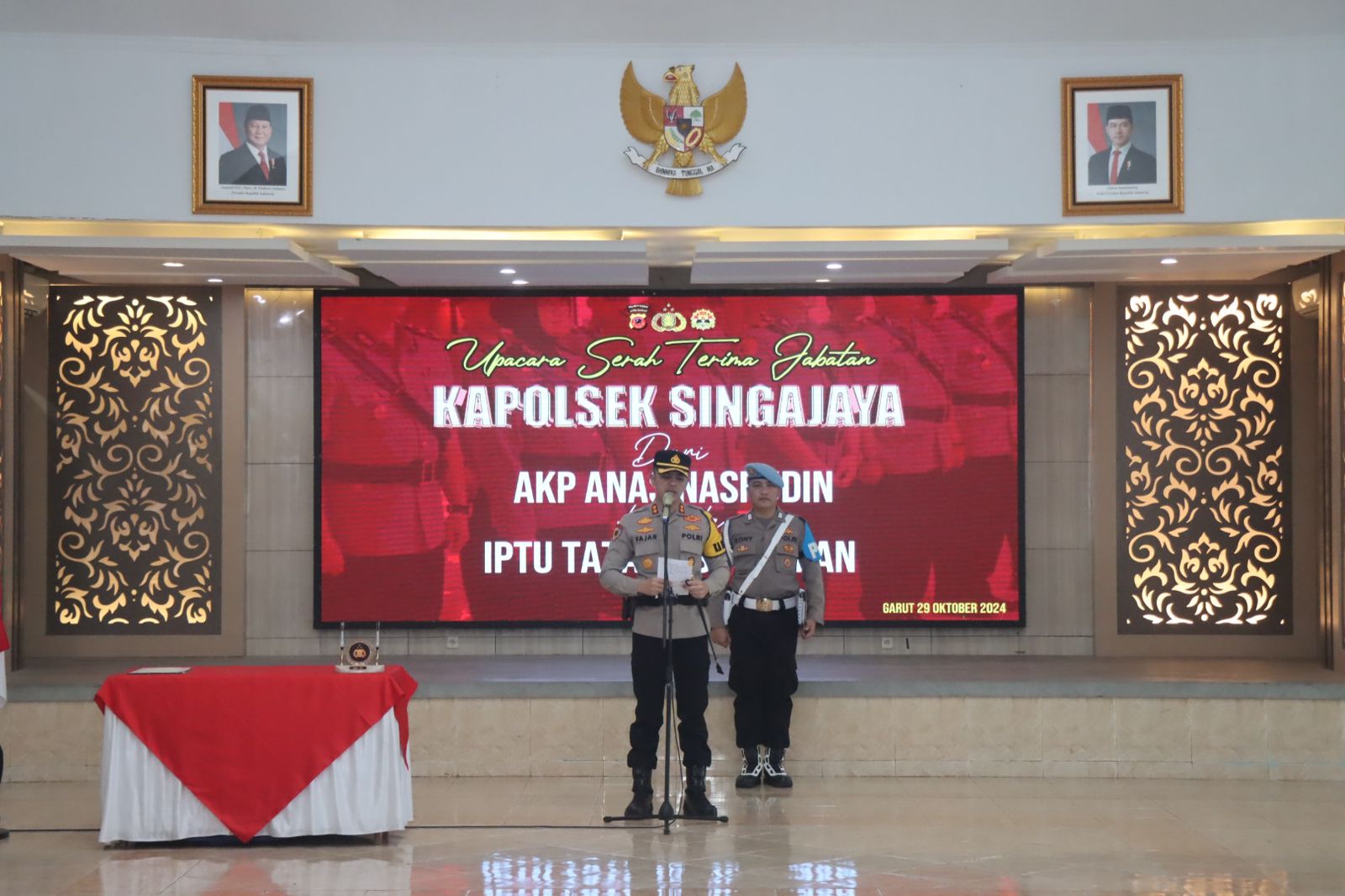 Kapolres Garut menyampaikan ucapan terima kasih kepada pejabat lama Kapolsek Singajaya AKP Anas Nasrudin, atas pengabdian dan dedikasinya selama menjabat selama 1 tahun 1 bulan.