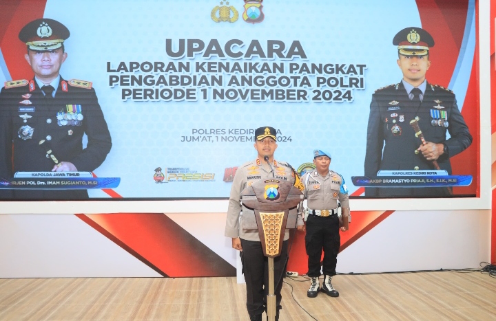 KEDIRI KOTA || JURNALPOLRI.MY.ID – Kapolres Kediri Kota AKBP Bramastyo Priaji, S.H., S.I.K., M.Si. memimpin upacara laporan kenaikan pangkat pengabdian periode 1 November 2024. Upacara digelar di Rupatama Polres Kediri Kota, Jumat (01/11).